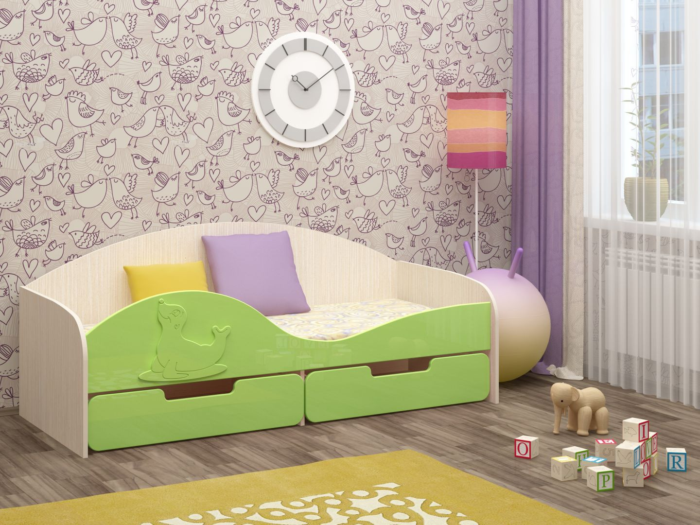 Кровать "Юнга-8" МДФ - превосходный выбор для детской комнаты вашего ребенка. Кровать оснащена бортиком с накладкой в виде милого тюленя, который защищает вашего ребенка от возможного падения во сне. Снизу кроватки находятся два выдвижных ящика, в которых удобно хранить детские игрушки, одежду или белье. Эта оригинальная кроватка поразит Вас своим милым дизайном.