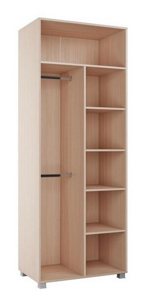 • Шкаф двухстворчатый состоит из антресольной ниши во всю ширину, секцией с полками и секцией с 2мя штангами, данные секции универсальные, могут располагаться с любой стороны.