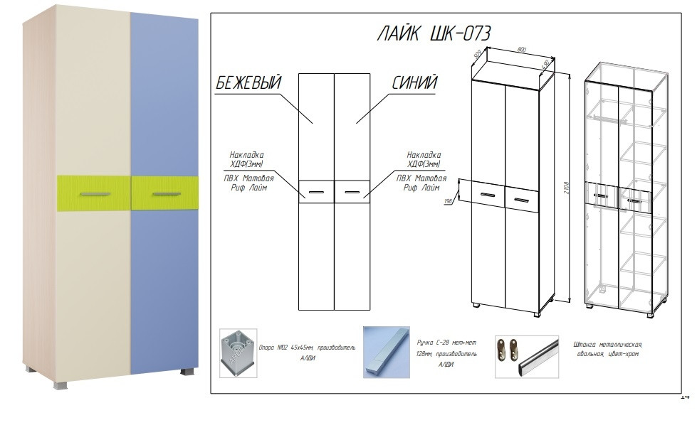 • Накладки на фасадах выполненные из ХДФ толщиной 3мм, облицованные Плёнкой ПВХ Матовая Риф Лайм, расположены по центру фасадов, что позволяет им быть взаимозаменяемыми и открываться как на правую, так и на левую сторону.